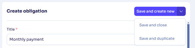 When creating a new obligation, the former Save and Close button has been renamed Save and create new with added dropdown options to facilitate multiple creations of obligations:Save and create new creates the current obligation and opens a new blank form with default values.