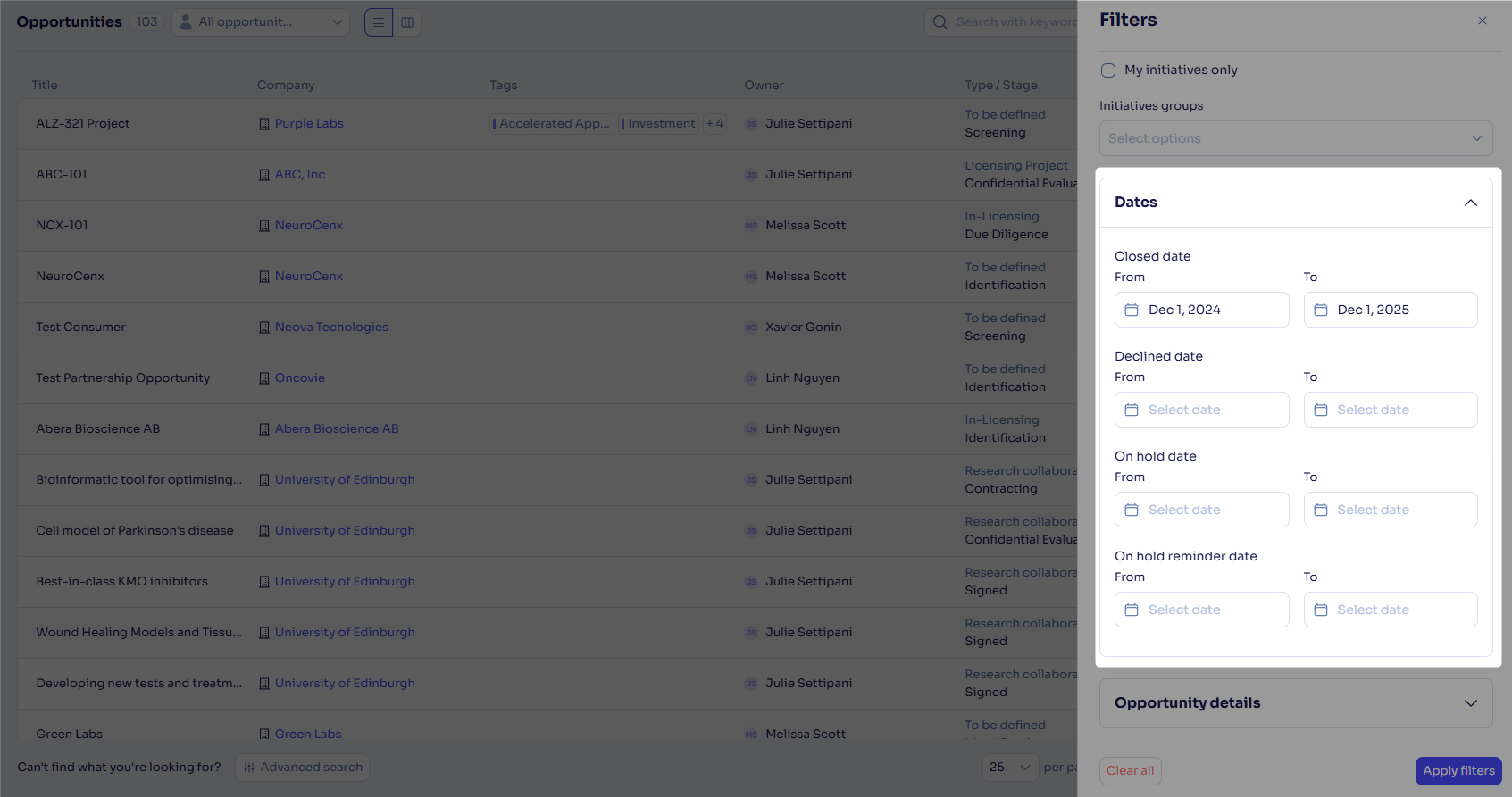 Filter opportunities by closed, declined, on-hold, and reminder dates
