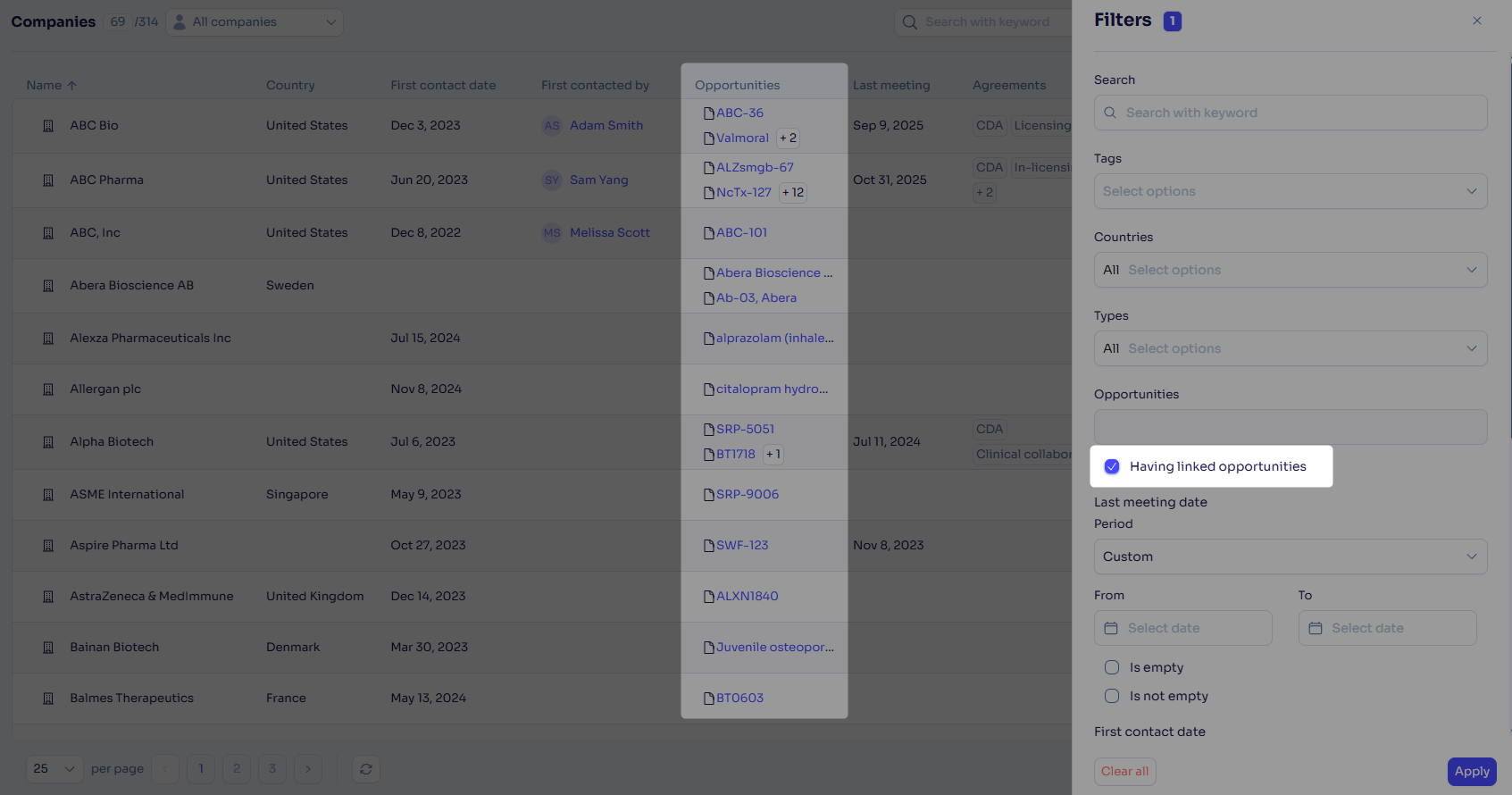 The company hub now includes a Having linked opportunities filter that limits the view to companies with opportunities associated with them.