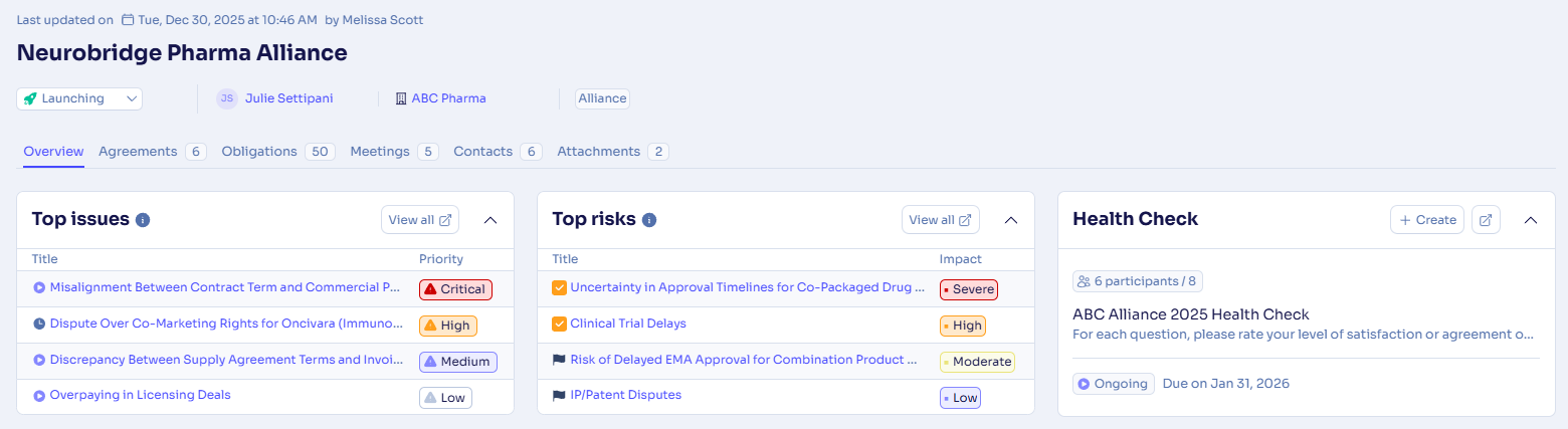 Navigate directly from alliances to the relevant filtered views in the new Health checks and Risks & Issues modules.