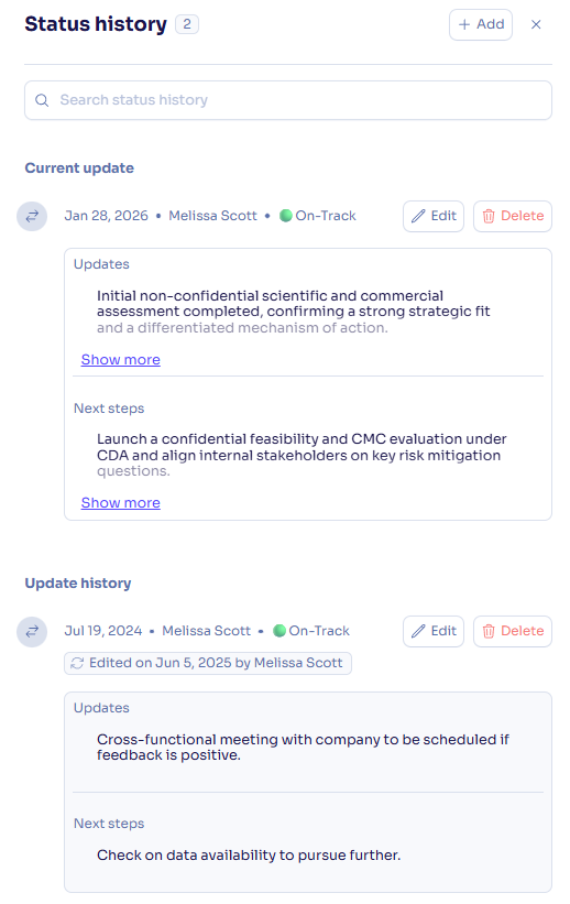 The Status update and Next steps were previously consolidated with other information in the activity stream of opportunities and alliances. To access and manage the status update and next steps information more efficiently, we moved them to a dedicated side panel, accessible from the Status update section in the Overview tab of opportunities and alliances. From there, you can edit and delete current and past updates sorted by date with clear sections and pagination.