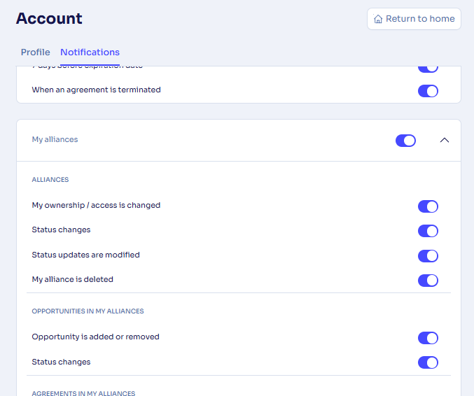 Receive new email notifications for alliances and related agreements, obligations, milestones, and opportunities, and manage them from your Account page.